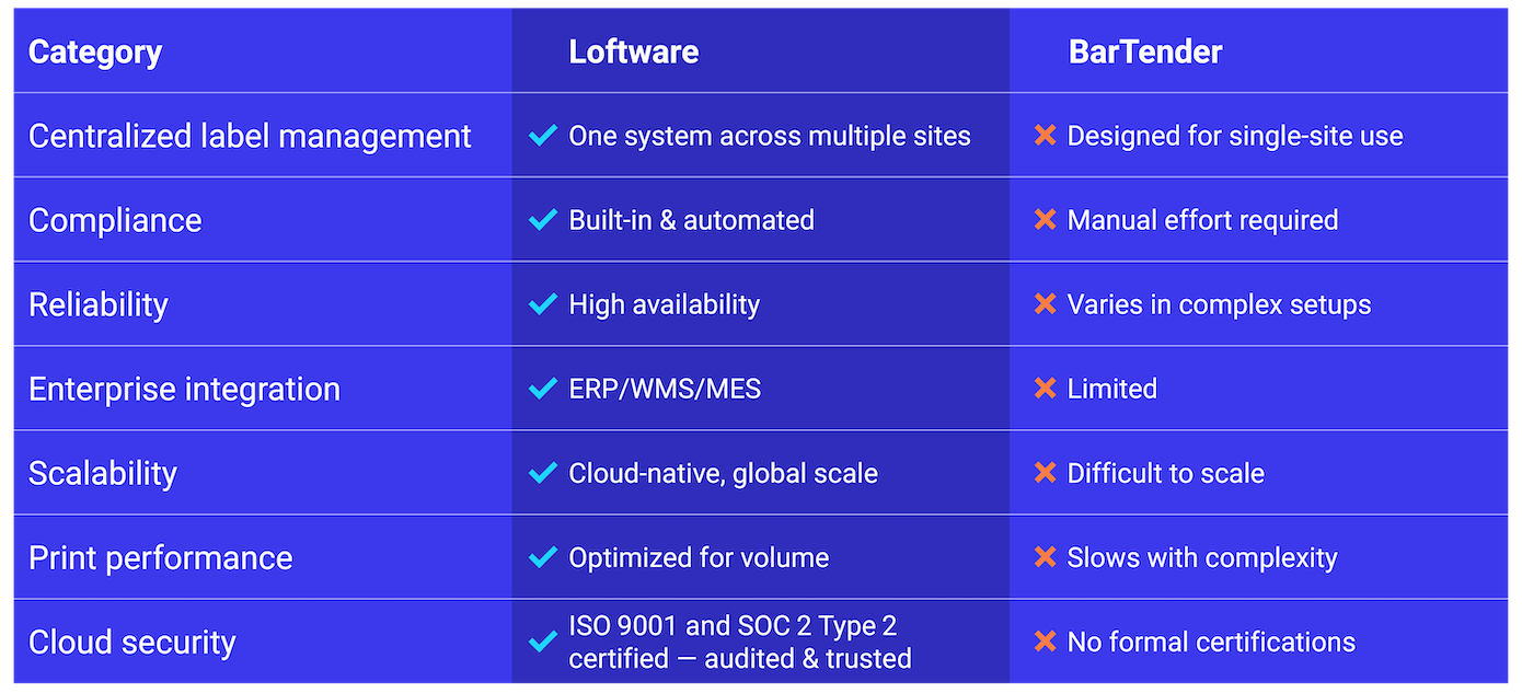 BarTender may pour a decent drink for single-site setups with simple needs, but when you’re managing multiple facilities, suppliers, and production lines, you need more than just the basics. You need Loftware.